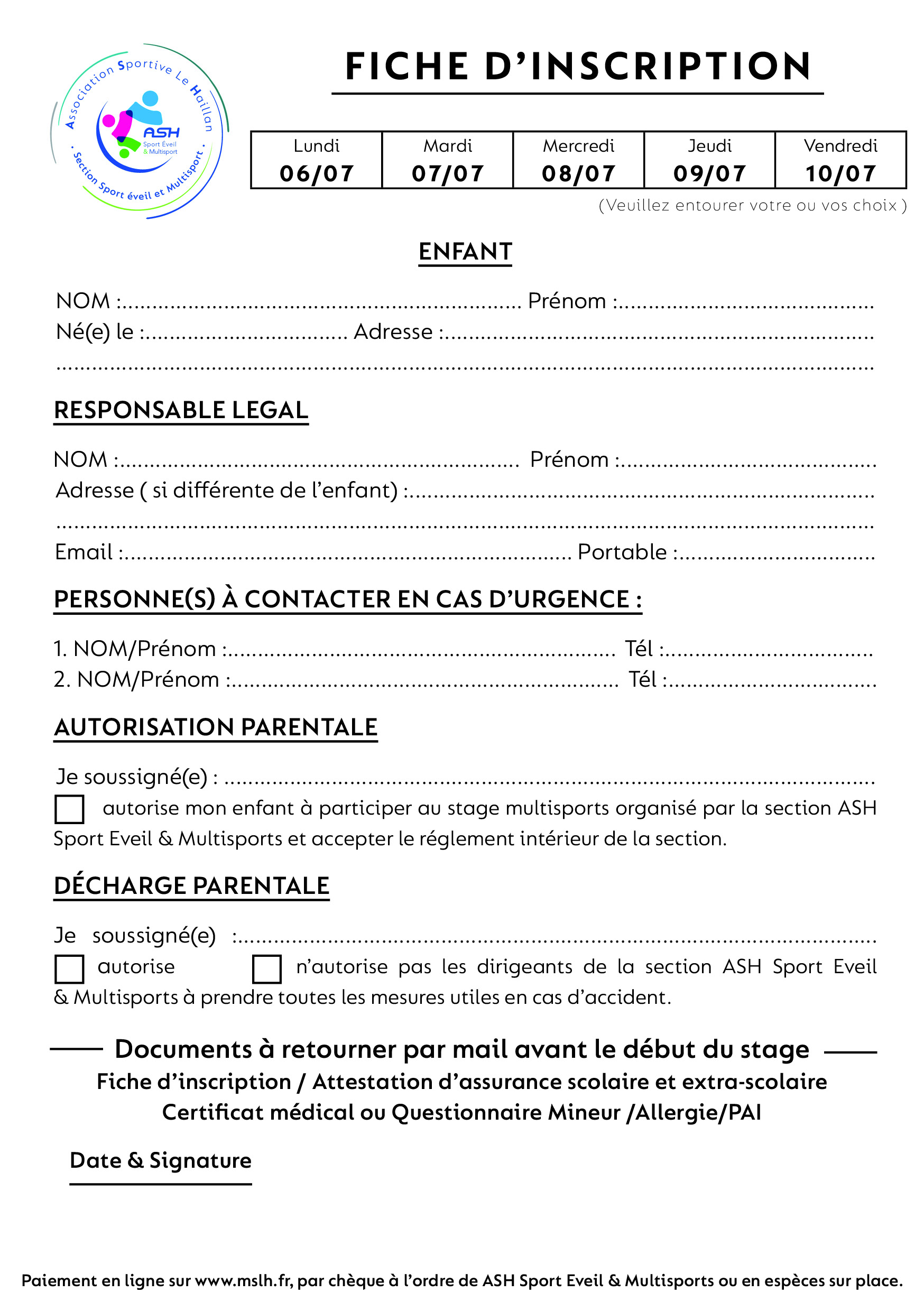 - Chèque à l’ordre de l’ASH Sport Eveil & Multisports